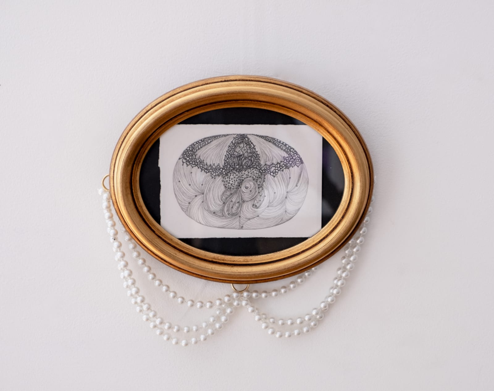 This collection of work is an exploration of identity, presence and the complexity of tracing absence through the lens of pattern and decoration. The frames are integral to the narrative that informs each piece, glorifying the space they hold. Whilst the ropes of pearls mirror the shapes within the drawings. Seen as embroideries, threads of ink and graphite weave their stories of memory and experience. Seeking to make visible those histories, erased, across time and space.