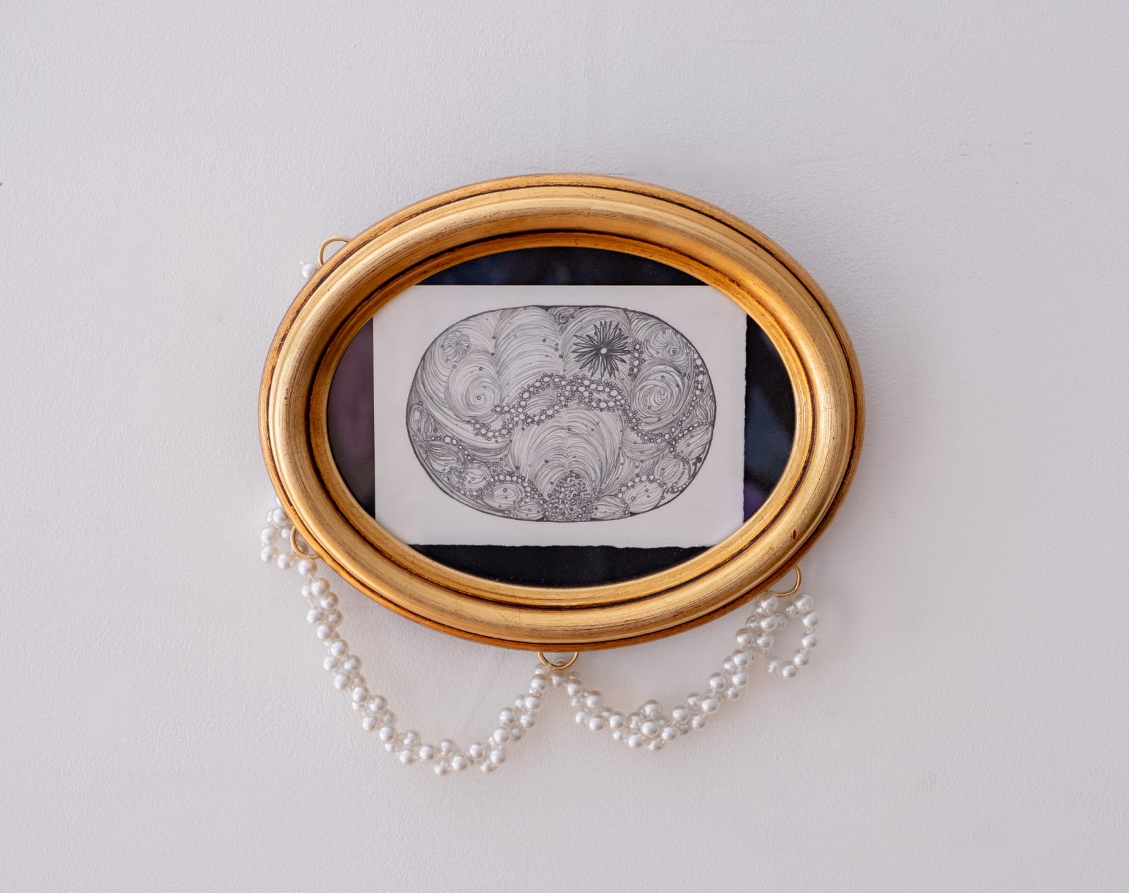 This collection of work is an exploration of identity, presence and the complexity of tracing absence through the lens of pattern and decoration. The frames are integral to the narrative that informs each piece, glorifying the space they hold. Whilst the ropes of pearls mirror the shapes within the drawings. Seen as embroideries, threads of ink and graphite weave their stories of memory and experience. Seeking to make visible those histories, erased, across time and space.