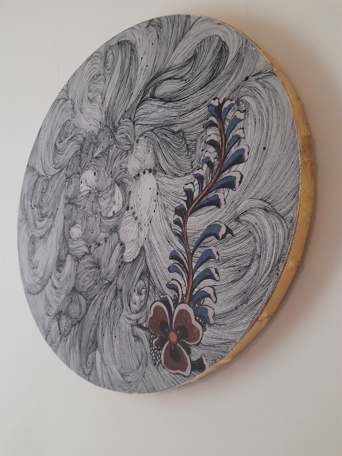 Graphite, Ink, Collage and Paper on Canvas. Gold Leaf. Hand Embellished